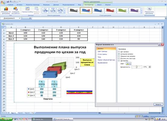 Приложение Excel дает возможность редактировать текст названий и подписей, изменять шрифт, выравнивание и фоновый узор. При выделении числовой подписи допускается задание нового числового формата.