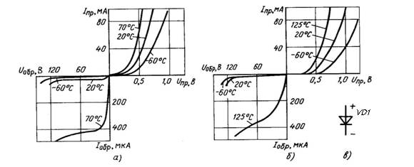 При увеличении температуры прямая ветвь характеристик становится более крутой. Обратный ток в кремниевых диодах меньше, чем у германиевых.