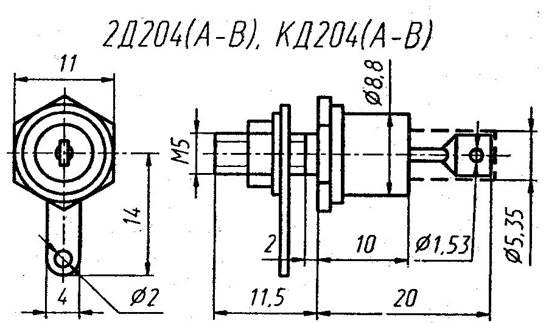 На рисунке 2.14 показана конструкция кремниевых диффузионных выпрямительных диодов 2Д204А,Б,В, КД204А,Б,В. Диоды предназначены для преобразования переменного напряжения частотой до 50кГц. Выпускаются в металлостеклянном корпусе с жёсткими выводами. Тип диода и схема соединения диодов с выводами приводятся на корпусе. Масса диодов не более 6г.