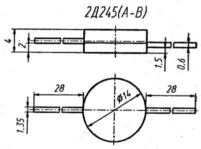На рисунке 2.15 показана конструкция кремниевых эпитаксиально-диффузионных диодов 2Д245А, 2Д245Б,В. Диоды предназначены для преобразования переменного напряжения частотой до 200 кГц во вторичных источниках электропитания. Выпускаются в металлопластмассовом корпусе с гибкими выводами. Положительный электрод соединён с металлическим основанием корпуса. Тип диода приводится на корпусе. Масса диода не более 4г.