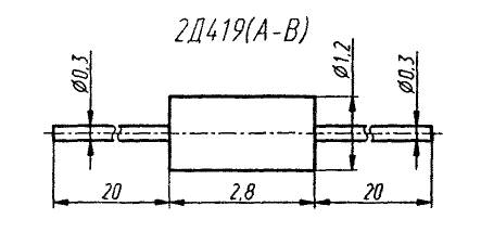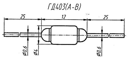 На рисунке 2.16 показана конструкция германиевых микросплавных высокочастотных диодов ГД403А, ГД403Б, ГД403В, предназначенные для применения в качестве детекторов амплитудно-модулированных сигналов в радиовещательных приёмниках. Они выпускаются в металлостеклянном корпусе с гибкими выводами. Тип диода и схема соединения электродов с выводами приводится в корпусе. Масса диода не более 0,6г.