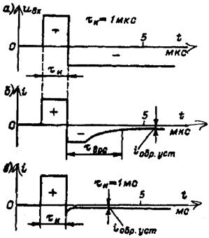 Если импульс прямого тока имеет длительность значительно большую, чем длительность рассмотренных переходных процессов, то импульс обратного тока получается во много раз более коротким (рисунок 2.26, в) и его можно не принимать во внимание.