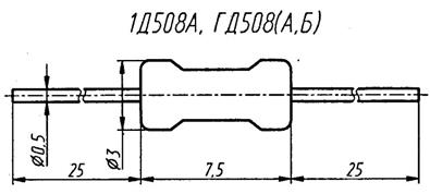 На рисунке 2.27 показана конструкция германиевых импульсных микросплавных диодов 1Д508А, ГД508А, ГД508Б, предназначенных для применения в сверхбыстрых действующих формирователях импульсов. Выпускаются диоды в стеклянном корпусе. Масса диода не более 0,2 г.