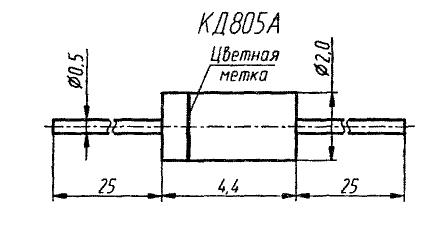 На рисунке 2.28 показана конструкция кремниевого диффузионного импульсного диода КД805А, предназначенного для применения в импульсных схемах. Выпускаются диоды в металлическом корпусе с гибкими выводами. Диод обозначается на корпусе продольной полосой красного цвта. Масса диода не более 0,15 г.