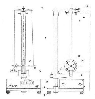 1 – основание прибора. 2 – регулируемые ножки. 3 – колонка. 4 – неподвижный верхний кронштейн. 5 – подвижный нижний кронштейн. 6 – электромагнит. 7 – фотоэлектрический датчик. 8 – вороток для регулировки и крепления нити. 9 – фотоэлектрический датчик 10 – диск. 11 – ось. 12 – оконное кольцо. 13 – указатель высоты. 14 – миллисекундомер.