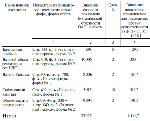 Рассчитать уровень существенности на примере на примере условного экономического субъекта ОАО «Факел» (прил. 7). В гр. 2 табл. 4.1 приведены показатели из финансовой отчетности ОАО «Факел», в гр. 4 — значение, применяемое для нахождения уровня существенности.