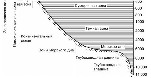 В океане и входящих в него морях различают прежде всего две экологические области: толщу воды – пелагиаль и дно – бенталь (рис. 38). В зависимости от глубины бенталь делится на сублиторальную зону – область плавного понижения суши до глубины примерно 200 м, батиальную – область крутого склона и абиссальную зону – область океанического ложа со средней глубиной 3–6 км. Еще более глубокие области бентали, соответствующие впадинам океанического ложа, называют ультраабиссалью. Кромка берега, заливаемая во время приливов, называется литоралью. Выше уровня приливов часть берега, увлажняемая брызгами прибоя, получила название супралиторали.