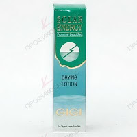 Лосьон-болтушка подсушивающий (проф. израильская марка GIGI, серия "Solar Energy"). Оказывает противовоспалительное, вяжущее, подсушивающее, осветляющее, успокаивающее, анестезирующее и охлаждающее действие на кожу. Применяется при различных формах акне и постакне. Содержит биосеру, камфару, окись цинка, карбонат магния, каолин, лимонную кислоту.