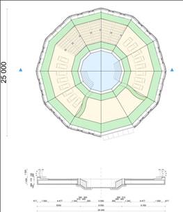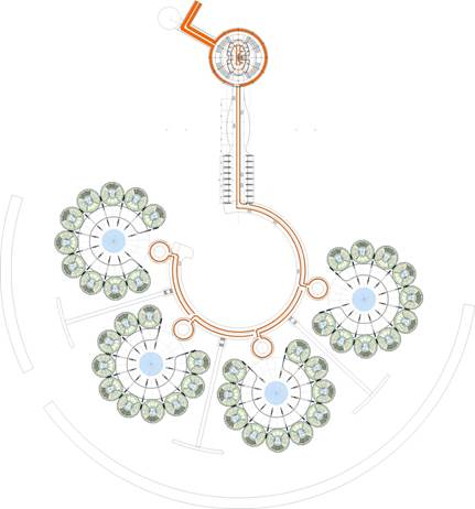 Кольцо, соединяющее мост и рекреационные сооружения на воде Внешний радиус 70 м, внутренний 60 м, внутри кольца устроен транспортный проезд. Ширина проезжей части 6м, по обеим сторонам от которой пешеходный проход 2 м.Сверху предусматривается пешеходный проход по озелененной аллее. Шаг колонн 12 м.