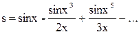 , т.е. в числителе показатель степени k при аргументе функции синус увеличивается на 2, а в знаменателе – на 1 увеличивается коэффициент пропорциональности n при х. Знакопеременность членов ряда обеспечивается множителем (-1)t. Если t чётное, от знак члена положительный, если t – нечётное, то знак члена – отрицательный. Первое значение суммы s = sin x, т.к. это выражение (sin x) в общий член уi не входит.