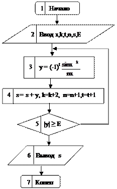 как сумма предыдущего значения (sin 0,75) и значения у. Затем k,t и n получают приращения и становятся равными 5, 2 и 3 соответственно. После этого выполняется проверка на завершение циклов вычислений – если модуль у (i-го члена ряда) у ещё больше Е=0.01, то выполняется переход на новое вычисление у с коэффициентами k=5, t=2, n=3, опять вычисляется s = s + y, но в качестве предыдущего s уже используется