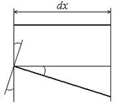 На расстоянии х от заделки выделим элемент оси балки длиной dx в исходном и деформированном состоянии (см. рис.4.31). В сечении балки х погиб – n, в сечении х + dx прогиб увеличился на величину dn. Поскольку длина элемента мала, отрезок изогнутой оси заменим отрезком прямой, касательной к изогнутой оси в сечении х (рис.4.32). Проведем от левого края деформированной оси балки до вертикальной прямой, соединяющей исходную и деформированную оси в сечении х + dx, горизонтальную прямую. Получили в результате прямоугольный треугольник с катетами dx и dn.