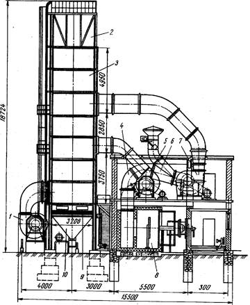1 – вентилятор охладительной шахты; 2 – надсушильный бункер; 3 - сушильные шахты; 4 – всасывающий воздуховод вентилятора; 5 – вентилятор второй зоны; 6 – всасывающий воздуховод вентилятора; 7 – вентилятор первой зоны; 8 – топка; 9 – выпускной затвор; 10 – подсушильный бункер