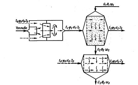 - относительная влажность, %;d - влагосодержание, г пара/кг с. в.;I - энтальпия, кДж/кг с. в. (ккал/кг с. в.); индексы: 0 - соответствуют параметрам на входе в топку и охладительную шахту; 1 – на входе в сушильную шахту; 2 – на выходе из сушильной шахты; 3 – на выходе из охладительной шахты