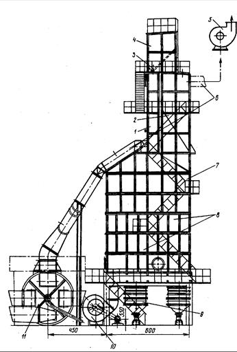 1 – камера нагрева; 2 – осадочная камера; 3 – загрузочное устройство; 4 –бункер; 5 – вентилятор камеры нагрева; 6 – воздуховоды; 7 – тепловлагообменник; 8 - шахты окончательного и промежуточного охлаждения; 9 - бесприводные выпускные устройства; 10 – вентиляторы; 11 – топка