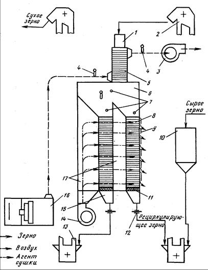 25-70 приведена на рисунке 7.7. Сырое зерно из бункера (со складов, элеватора, с железнодорожного транспорта или автомобильного транспорта), а рециркулирующее из охладительной шахты подают в норию. Нория смесь сырого и рециркулирующего зерна направляет в бункер, расположенный над камерой нагрева. При помощи выпускного механизма зерно в виде «дождя» поступает в камеру нагрева с тормозящими элементами, где оно встречным потоком агента сушки нагревается и частично сушится. Из камеры нагрева зерно направляется в тепловлагообменник, где происходит выравнивание температуры зерна и частично перераспределяется влага, как в отдельном зерне, так и во всей массе. Рециркулирующее сухое более нагретое зерно передает тепло сырому зерну, а сырое зерно передает влагу рециркулирующему зерну.
