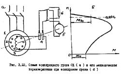 После включения постоянного тока в обмотку возбуждения (при n2=0.95n1) возникает синхронизирующий момент, вынуждающий ротор втянуться в синхронизм. С этого времени машина работает как синхронный двигатель. На рис.3.22 показана схема асинхронного пуска. При пуске обмотка возбуждения отключается от возбудителя и замыкается на резистор с сопротивлением в 10 раз большим, чем сопротивление самой обмотки. Это необходимо для улучшения пусковой характеристики и предотвращения пробоя изоляции обмотки возбуждения.