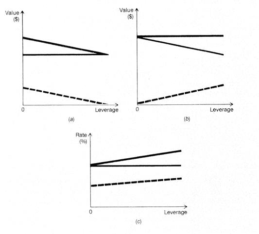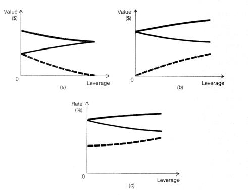 На рис. 14.4a стоимость старых и новых выпущенных акций объединяются в общую стоимость акционерного капитала. Заметим, что с увеличением левереджа, общая стоимость падает, но стоимость старых акций увеличивается. На рис. 14.4b стоимость акционерного капитала и займа эквивалентны полной стоимости компании. Заметим, что полная стоимость компании увеличивается с увеличением левереджа. На рис. 14.4c отображено поведение требуемых процентов по займу, акциям и стоимости капитала. Несмотря на увеличение процентов по кредиту и требуемой нормы доходности по акциям, стоимость капитала компании уменьшается, когда левередж (IP/EBIT) увеличивается (с учетом принятых ранее допущений).