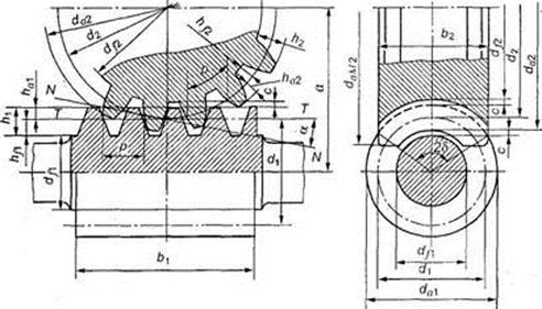 Диаметры начальных окружностей червяка и колеса: dw1=d1, dw2=d2