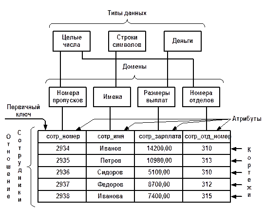 В примере отношения «сотрудники» имеются данные трех типов: символьные, целые числа и "деньги".