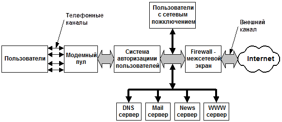 Если рассматривать эту схему, то первое, на чем стоит остановиться, — это система телефонного подключеният абонентских станций пользователей. Наиболее эффективны многоканальные телефонные линии и модемные пулы (это множество модемов, объединенных в единую многоканальную модемную систему)— пользователю не нужно перебирать много номеров телефонов. Желательно также использование цифровых АТС.