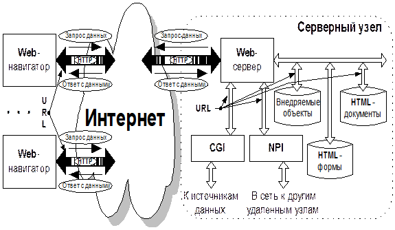 Web-навигатор при загрузке HTML -документов доставляет на абонентскую станцию на основании URL-ссылок также все файлы, объекты и программы оперативного управления HTML -формами. Последние интерпретируются Web-навигатором клиента при загрузке и просмотре соответствующих HTML -документов. Для доступа к информации, которая не может обрабатываться Web-сервером непосредственно, используется система программных шлюзов CGI или NPI. Шлюз, получив запрос от Web-сервера, обрабатывает его сам или выступает в качестве посредника.