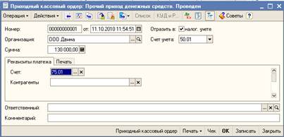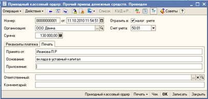 Прочий приход денежных средств. Учредителем Ивановым П.Р. внесены в кассу ООО Двина денежные средства в сумме 130000 рублей в качестве вклада в уставный капитал. Счет 75.01