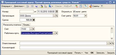 Сформируйте документ " Приходный кассовый ордер ". Прочий приход денежных средств