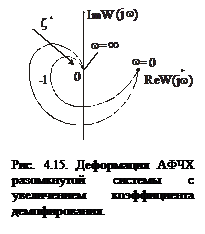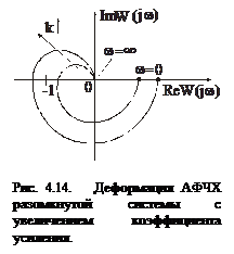 Нетрудно видеть, что увеличение k приводит к "раздутию" годографа, т.е. к уменьшению запаса устойчивости. Для повышения запаса устойчивости системы необходимо снижать k (рис. 4.14).