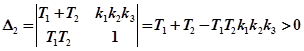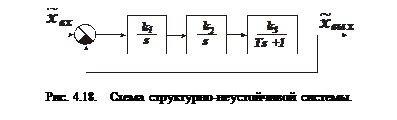 Последняя система структурно-устойчива, т.е. выбором коэффициентов T1, T2, k1, k2, k3 можно добиться устойчивости. Из последнего выражения видно также, что увеличение запаса устойчивости реализуется за счет уменьшения коэффициентов усиления звеньев.