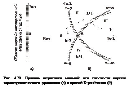 (рис. 4.20,а), область, в которой корни имеют отрицательные вещественные части, будет находиться все время слева. Заштрихуем мнимую ось плоскости корней характеристического уравнения слева. Имея это в виду, будем теперь перемещаться вдоль кривой D-разбиения от точки