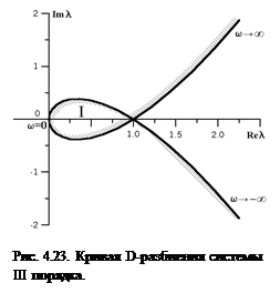. Полученная кривая является кривой D–разбиения. Кривая D–разбиения для отрицательных и положительных частот симметрична относительно действительной оси, поэтому можно строить лишь ее участок, соответствующий изменению частот