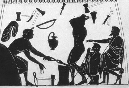 Рис. 7.7. Греческая кузница VI века до н.э. (изображение на вазе)