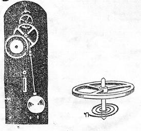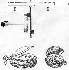 Рис. 9.4. Механизм равномерности хода гравитационных часов (вверху) и первые ручные часы Генлейна ("нюренбергские яйца")