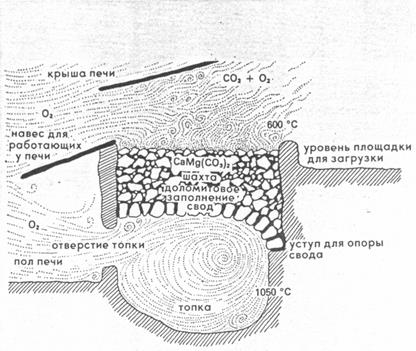 Рис. 10.6. Процесс обжига доломита на схеме печи для обжига
