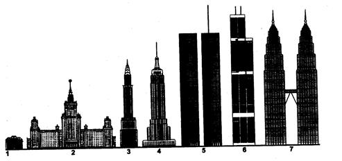 1 - здание страховой компании "Эквитейбл" высотой 43 метра (один из первых небоскребов). 2 - главное здание МГУ на Воробьевых горах - самый высокий небоскреб России (240 метров, 1953 год). 3 - небоскреб автомобильной компании "Крайслер" в Нью-Йорке (319 метров, 1930 год),4 - знаменитый Эмпайр Стейт Билдинг, долгое время бывший самым высоким зданием в мире (381 метр, 1931 год). 5 - близнецы-небоскребы Всемирного торгового центра в Нью-Йорке, разрушенные террористами 11 сентября 2001 года (по 417 метров каждый, 1972 год). 6 - чикагский небоскреб фирмы "Сирс" (443 метра, 1974 год). 7 - башни нефтяной компании "Петронас" в Куале-Лампуре (452 метра, 1997 год).