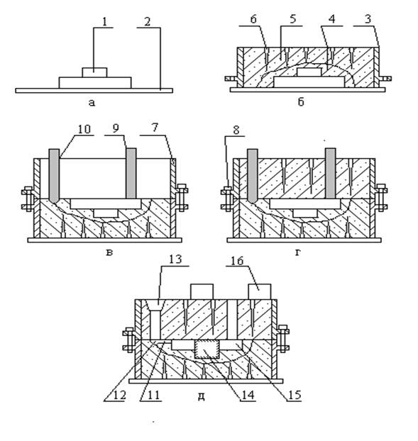 7 - верхняя опока; 8 - центрирующий штырь; 9 - модель выпора; 10 - модель стояка; 11 - питатель; 12 - зумпф; 13 - литниковая воронка; 14 - стержень; 15 - полость литейной формы; 16 – груз.