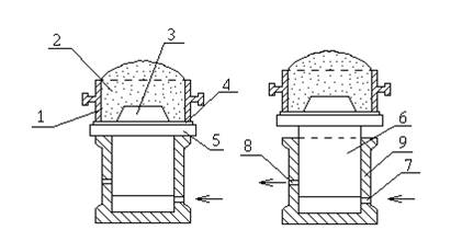 При уплотнении встряхиванием (рис. 11.1) на столе (5) формовочной машины укреплена плита (4) с моделью (3) на которую устанавливают опоку (1) и заполняют ее формовочной смесью (2). Под действием сжатого воздуха, поступающего под поршень (6) через впускное отверстие (7), стол формовочной машины (5) поднимается на высоту 30...80 мм. После того, как нижний срез поршня дойдет до уровня выпускного (выхлопного) отверстия (8), сжатый воздух выйдет из-под поршня и стол, падая, ударяется о станину (9) машины. Скорость стола, модельной плиты и опоки становится равной нулю, а смесь, продолжая двигаться, уплотняется: ее кинетическая энергия при ударе переходит в работу уплотнения. В результате повторных ударов формовочная смесь уплотняется. Таким образом уплотнение смеси при встряхивании происходит под действием силы тяжести.