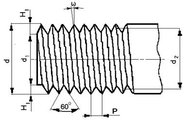 Наружный диаметр d - диаметр цилиндра, описанного около резьбовой поверхности. У болтов он измеряется по вершинам профиля, у гаек - по впадинам резьбы. Внутренний диаметр d1 - диаметр цилиндра, вписанного в резьбовую поверхность. У болтов диаметр d1 измеряется по впадинам, а у гаек - по вершинам резьбы; H1 - глубина резьбы.