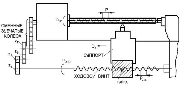 Если бы шаг P резьбы на заготовке был бы равен шагу Pх.в. ходового винта, то последний должен был бы вращаться с такой же скоростью, как и шпиндель. Но чаще всего P отлично от Pх.в., поэтому и указанные скорости вращения не равны. Для изменения соотношения скоростей шпинделя и ходового винта между ними устанавливают сменные зубчатые колеса.