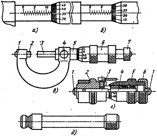 Микрометрические инструменты. Применяют для наружных измерений с точностью до 0,01 мм. Их выпускают с пределами измерений 0-25 мм, 25-50 мм, 50-75 мм и т.д. Микрометр (рис.8,в) состоит из скобы 1, имеющей на одном конце пятку 2, на другом - втулку-стебель 5, внутрь которой ввернут микрометрический винт 3. Торцы пятки и микрометрического винта являются измерительными поверхностями. Винт 3 жестко связан с барабаном 6, на конической части которого нанесена шкала нониуса с 50 делениями.