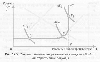 Итак, кривая совокупного спроса может пересекать кривую совокупного предложения на горизонтальном, промежуточном и вертикальном участках. Каждый раз при этом возникает макроэкономическое равновесие, т.е. весь произведенный продукт оказывается полностью купленным. Однако это три разные равновесные ситуации.
