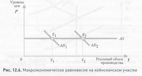 Если кривые совокупного спроса и совокупного предложения пересекаются на горизонтальном участке (см. рис. 12.6), возможно решить задачу роста реального объема производства (перемещение из положения Y1 в положение Y2) при сохранении равновесного состояния за счет стимулирования совокупного спроса. Именно поэтому кейнсианцев еще называют сторонниками теории спроса.