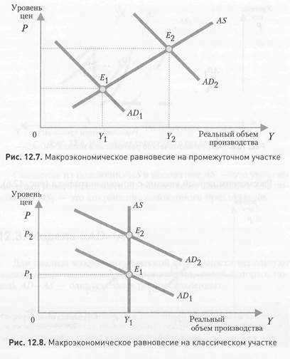 Любые попытки простимулировать совокупный спрос на вертикальном участке (рис. 12.8) приведут исключительно к росту цен (перемещение из положения Р1 в положение P2).
