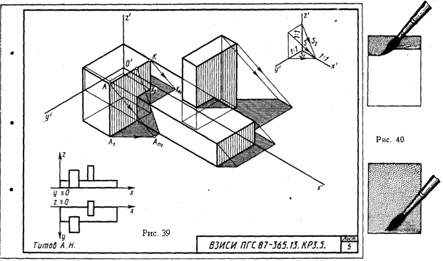 Указания к выполнению задач 1, 2. При построении теней в ортогональных проекциях необходимо ознакомиться с указаниями к выполнению задачи 4 листа 4А. Пример решения одной из задач приведен на рис. 37.