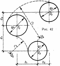Задача 1. Построить сопряжения трех окружностей с помощью прямой и двух дуг окружностей (внутренних или внешних). Исходные данные принимают по рис. 42 и табл. 19.