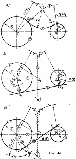 Указания к выполнению задачи 1. Все графические процедуры поэтапного построения сопряжений на чертеже обязательно сохранять. Оформление задачи выполнять аналогично оформлению задачи 2 листа 6 (см. рис. 41) и табл. 20. На рис. 44 приведены примеры сопряжения двух окружностей; а - внутреннее сопряжение дугой окружности радиуса г2; б - внешнее сопряжение прямой; в - внутреннее сопряжение прямой.