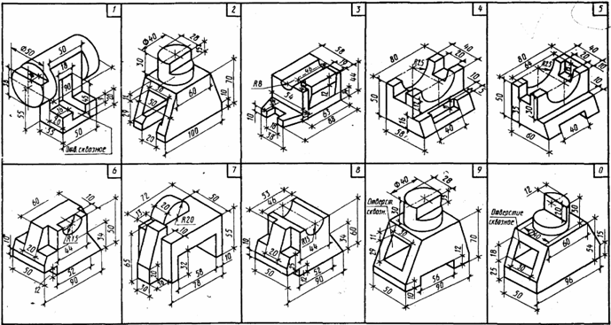 Задача. По заданному аксонометрическому изображению детали построить шесть основных видов. Индивидуальные задания приведены по вариантам в табл. 22.