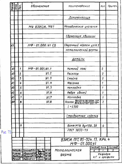 Указания к выполнению задачи. При выполнении работы необходимо изучить содержание спецификации узла (рис. 73) и особенности графического оформления чертежей металлических строительных изделий, изложенных в ГОСТ 2.410- 68, а т же в ГОСТ 2.312-72 и 2.315-68. Таблица 31