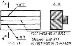 Сварные соединения выполняют на чертежах по требованиям ГОСТ 2.312-72. При наличии на чертежах одинаковых швов обозначение наносят у одного из изображений, а от изображений остальных одинаковых швов проводят линии-выноски с полками. Всем одинаковым швам присваивают один порядковый номер (рис. 74).